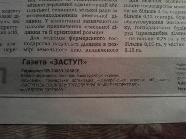 Справа в тім, що засновником вказаної газети ЗАСТУПУ є не політична партія, а однойменна громадська організація. Тому невідомо, чи ця газета виготовлена за кошти виборчого фонду політичної партії "Всеукраїнське аграрне об’єднання "ЗАСТУП”.
