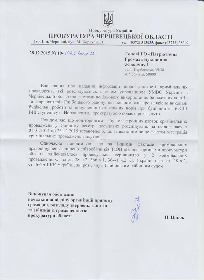 Чернівецький активіст Ігор Жижиян "розкопав" кримінальні провадження щодо керівника ТОВ "Надія" Василя Бічера, яка займається будівництвом школи в селі Йорданешти на чималу суму. Чоловік обурюється, "чому після ряду гучних кримінальних справ, до цього часу, більшість договорів підряду за державні кошти, заключають із фірмою із такою сумнівною репутацією". Про це він написав на своїй сторінці в Facebook.