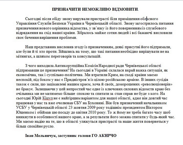 На редакційну скриньку BukNews надійшов лист від прес-секретаря ГО АКНРЧО Івана Білика, в якому він просить оприлюднити вкладений у нього матеріал. Вкладкою виявився лист заступника голови ГО АКНРЧО Івана Мельничука про підтримку комісією призначення пана Кіцула начальником управління СБУ в Чернівецькій області.