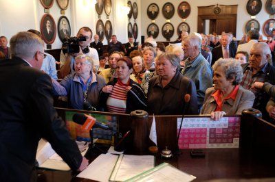 Бешлей пропонує перейти до розгляду порядку денного та пропонує включити до нього питання про введення мораторію на відміну соціальних проїзних та підвищення вартості проїзду. Пенсіонери вигукують: "Молодець!".