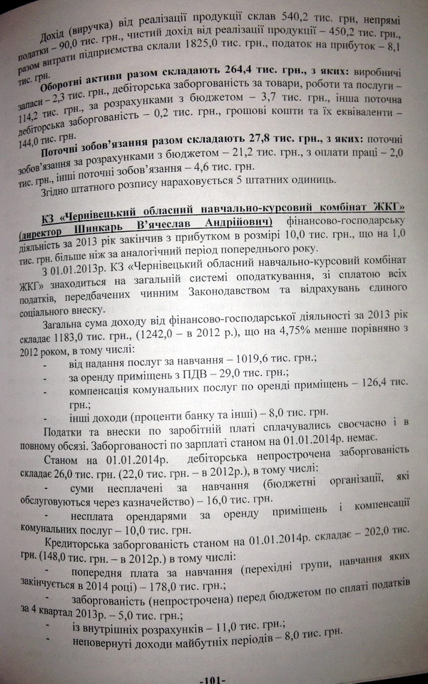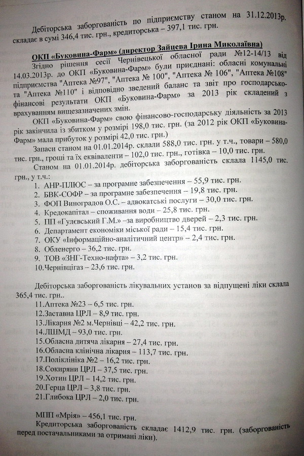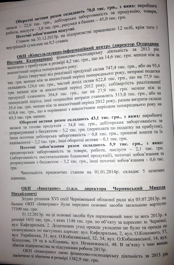 Так, в обласній раді працює постійна комісія з питань приватизації та управління об’єктами спільної власності територіальних громад сіл, селиш та міст Чернівецької області. Достатньо навести усього кілька прикладів фінансово-господарської діяльності комунальних підприємств краю за минулих рік для того, аби пересвідчитись у нагальній потребі зміни підходу до управління цим майном. Наприклад, обласне комунальне підприємство «Буковина-Фарм» минулий рік завершило зі збитком у розмірі 198 тисяч гривень, а дохід склав усього 42 тисячі гривень. А ось дебіторська заборгованість фірми станом на 1 січня 2014 року склала 1145 тисяч гривень та ще за відпущені ліки 365 тисяч гривень.