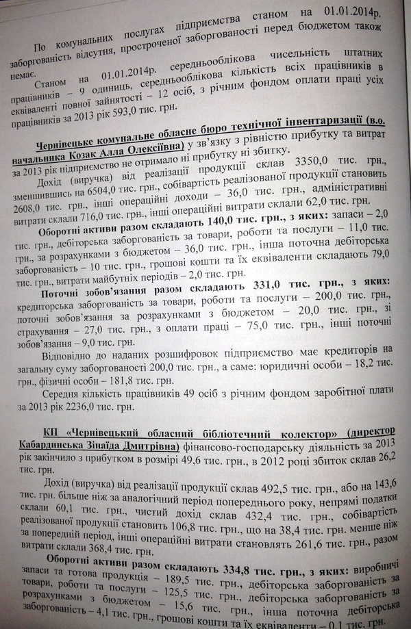 Або ще одне підприємство – «Кіновідеопрокат», яке спромоглось за рік заробити лише 4 тисячі гривень (у цей самий час дотація з обласного бюджету склала 590 тисяч гривень): підприємство отримало доходів на 750,8 тисяч гривень і видатки склали 746,8 тисяч. А Чернівецьке комунальне обласне бюро технічної інвентаризації вже три роки немає директора.