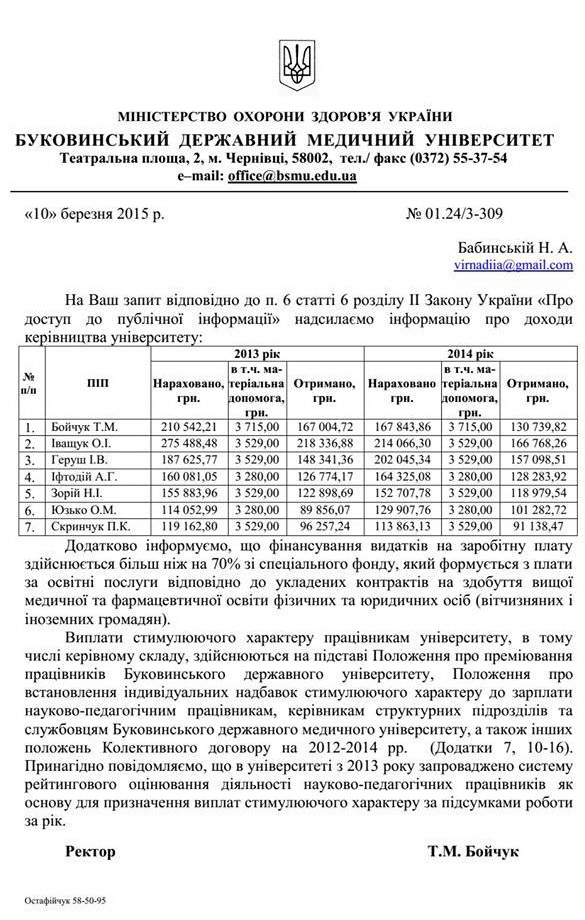 Ректор БДМУ Тарас Бойчук стверджує, що протягом 2014 року заробив 130 гривень. Згідно наданої навчальним закладом інформації, трохи більше суму отримав проректор з наукової роботи та міжнародних зв'язків Олександр Іващук, а саме - 166 тисяч гривень, проектор з науково-педагогічної роботи Ігор Геруш напрацював на 157.