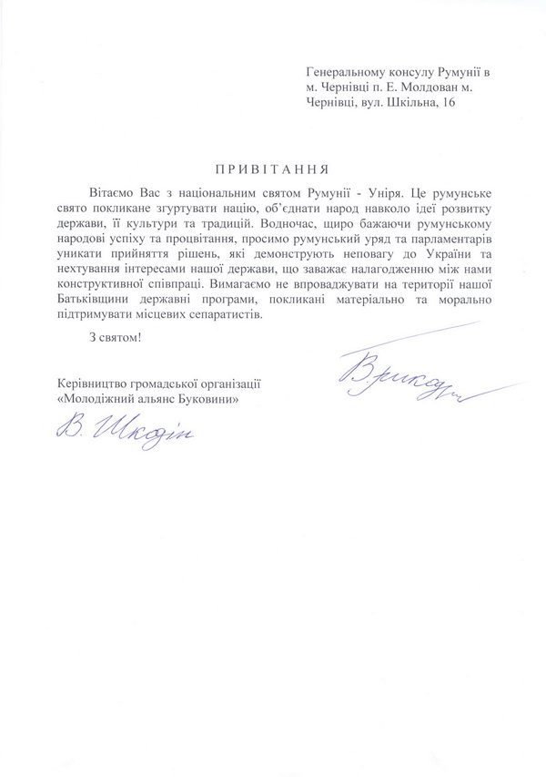 Вітаємо Вас з національним святом Румунії - Уніря. Це румунське свято покликане згуртувати націю, об'єднати народ навколо ідеї розвитку держави, її культури та традицій. Водночас, щиро бажаючи румунському народові успіху та процвітання, просимо румунський уряд та парламентарів уникати прийняття рішень, які демонструють неповагу до України та нехтування інтересами нашої держави, що заважає налагодженню між нами конструктивної співпраці. Вимагаємо не впроваджувати на території нашої Батьківщини державні програми, покликані матеріально та морально підтримувати місцевих сепаратистів.