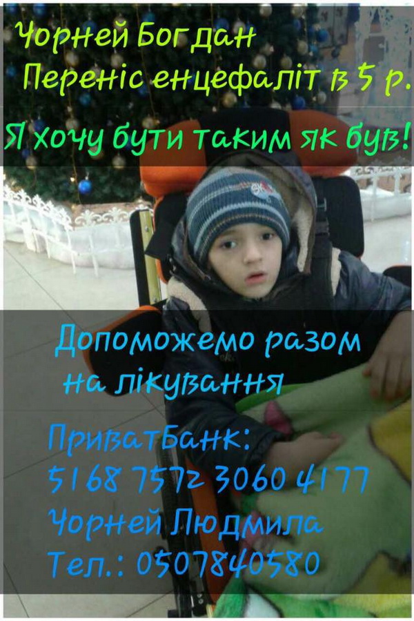І знову прохання про допомогу! Богданчик Чорней в жовтні 2014 року переніс вірусний енцефаліт, ускладнений правобічним геміпарезом, епілепсією, від якого сильно постраждав головний мозок, нервова та імунна системи. Три місяці перебував у комі. Один рік лежав, як рослина з постійними судомами.