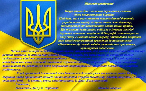 Від імені колективу Головного управління Державної фіскальної служби у Чернівецькій області та від себе особисто щиросердно вітаю Вас з одним із найголовніших свят нашої держави – Днем Незалежності!