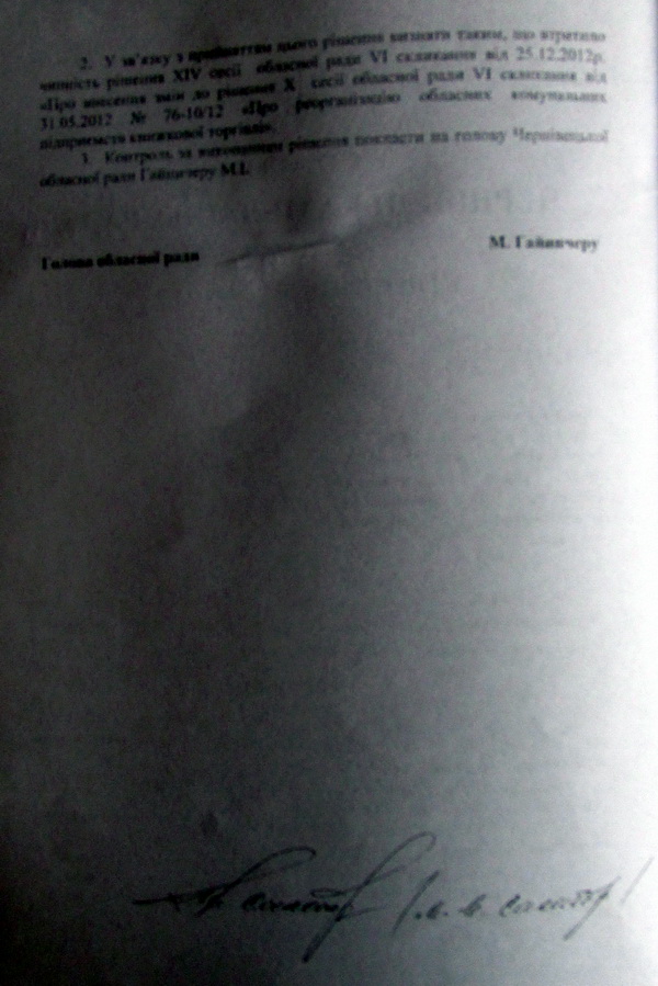І отут починається найцікавіше. Обласна влада ще 31 травня 2012 року (скоро відзначатимемо два роки) протиснула (інакше те, що відбувалося в залі і не назвеш) через Чернівецьку обласну раду рішення, про "Реорганізацію обласних комунальних підприємств книжкової торгівлі". У колгосп записали всі існуючі на той час комунальні книгарні і навіть назву для нього придумали - "Буковинська книга". Потребу в такому об'єднанні обґрунтували, звісно, найкращими намірами - порятунком тих самих книгарень.