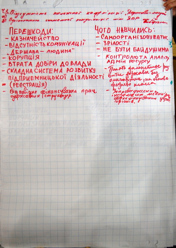 У процесі обговорення активісти разом визначили, які перешкоди можуть виникати на шляху впровадження місцевих ініціатив у громадах. Це брак практичного досвіду, відповідальності, страх перед невідомим, байдужість громади, бюрократизм, зокрема у сфері фінансового менеджменту (незадовільна і неадекватна робота казначейства), недосконале законодавство, хабарництво та корупція на місцевому рівні, недосконала система освіти, формальна, а не фактична децентралізація, брак коштів та фінансування на місцевому рівні, складність ведення підприємницької діяльності, відсутність спільного та довгострокового плану дій, відтік молоді у міста.