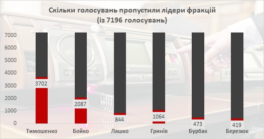 У других лидеров значительно лучшие показатели. Ответственное к голосованиям относились Бурбак (только 7% пропущенных) и Олег Березюк (6%).
