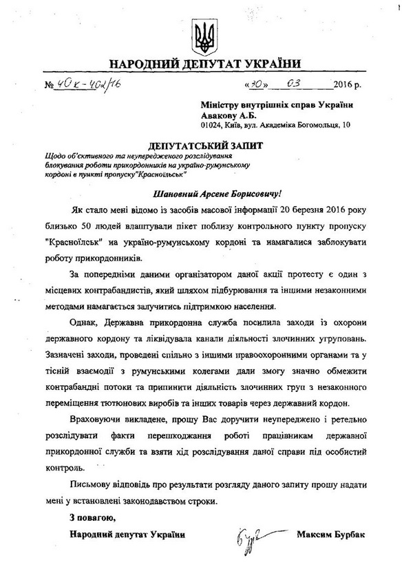 - Наступний крок в війні з контрабандою на Буковині. Депутатський запит на міністра МВС Арсена Авакова про розслідування фактів перешкоджання роботі державної прикордонної служби, - прокоментував документ Максим Бурбак.