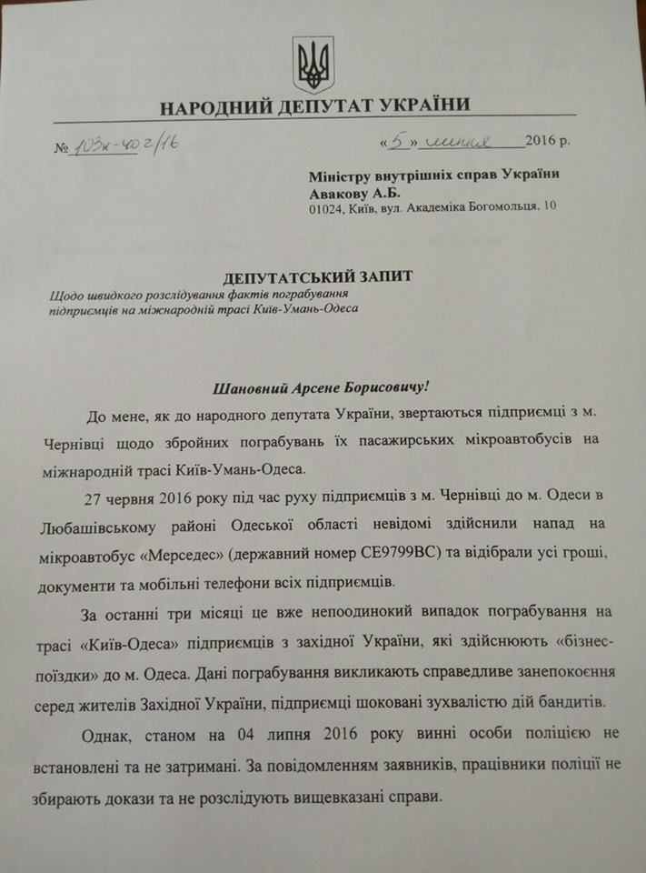 "До мене в офіс в Чернівцях звернулись пограбовані на Одеській трасі підприємці. Не міг не звернутися з депутатським запитом до Міністра МВС взяти під особистий контроль розслідування справ пограбування на трасі. Ці бандити з "большой дорогі" мають врешті решт бути ідентифіковані і сидіти на своєму місці - за ґратами", - написав нардеп.