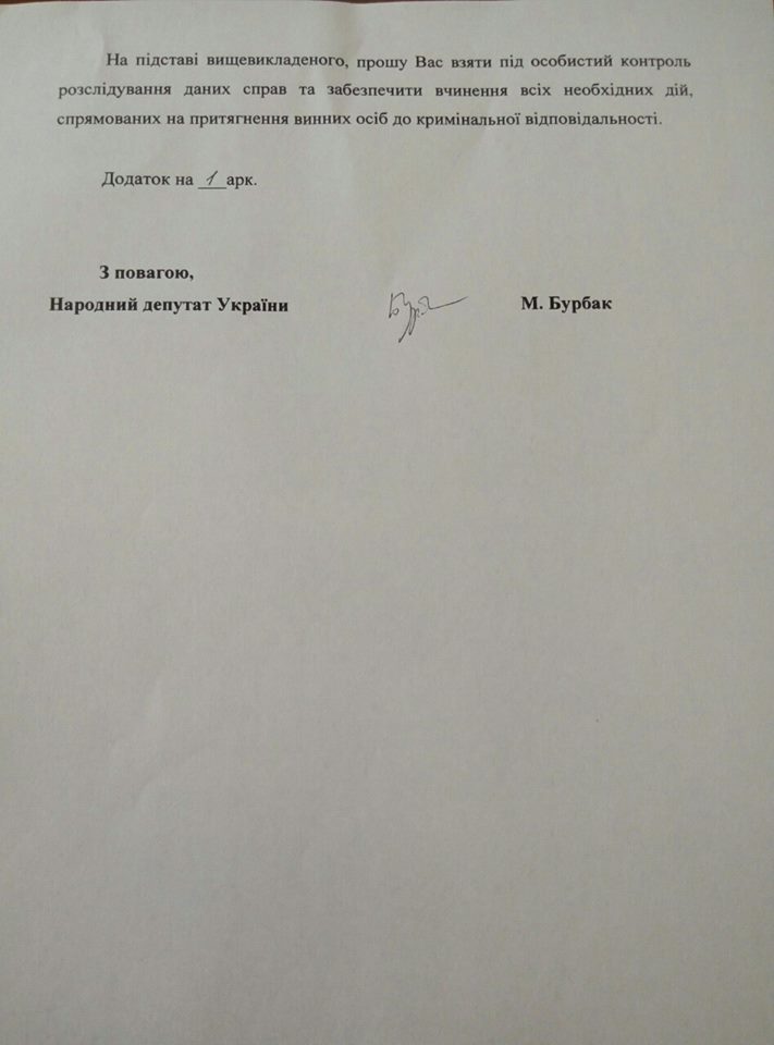 Бурбак просить Авакова особисто розслідувати розбій на Одеській дорозі (ДОКУМЕНТ)