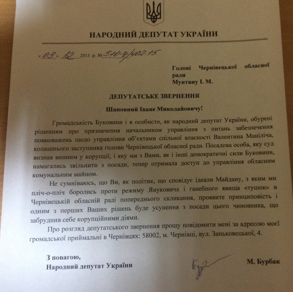 Народний депутат України звернувся з листом до новообраного голови Чернівецької обласної ради Івана Мунтяна. Текст листа політик оприлюднив на своїй сторінці у ФБ у супроводі коментаря наступного змісту.