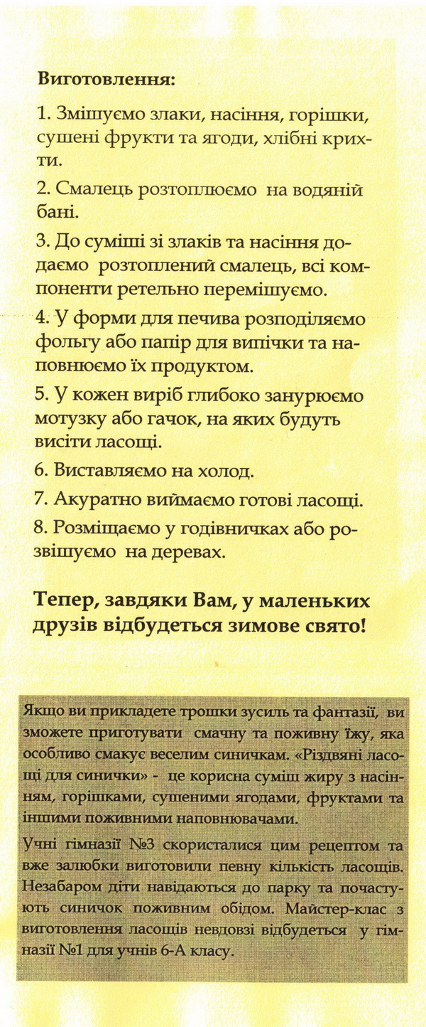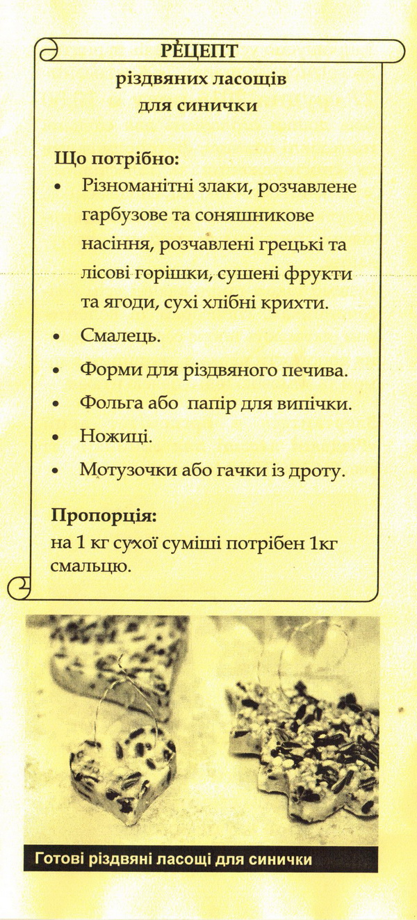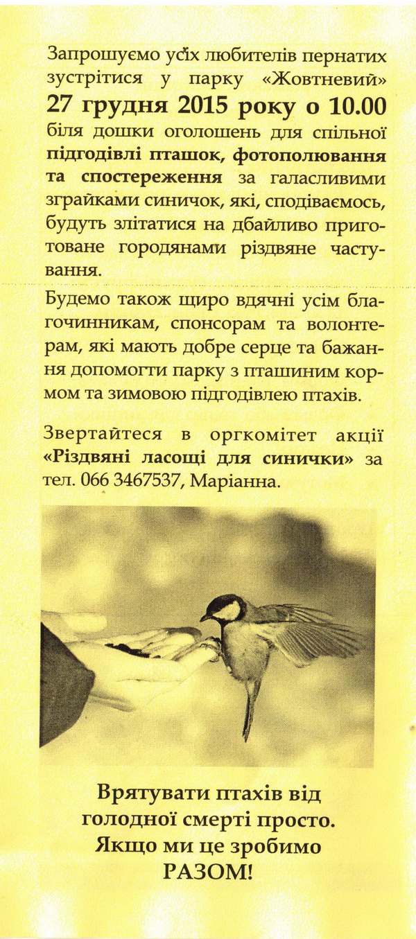 У неділю, 27 грудня, о 10.00 у парку «Жовтневий» відбудеться акція “Різдвяні ласощі для синички”, учасники якої можуть захопити із собою крупи та насіння для підгодівлі пернатих друзів.