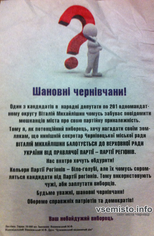 Тому я, як потенційний виборець, хочу нагадати своїм землякам, що нинішній секретар Чернівецької міської ради Віталій Михайлішин балотується до Верховної Ради України від правлячої партії – Партії Регіонів.