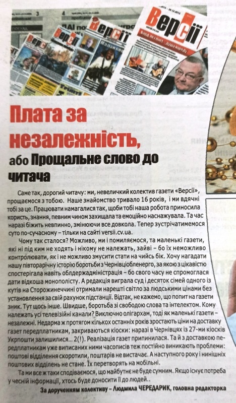 У Чернівцях редакція місцевої газети "Версії" заявила про припинення виходу видання у друк.