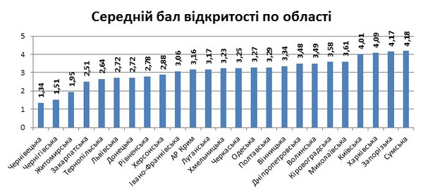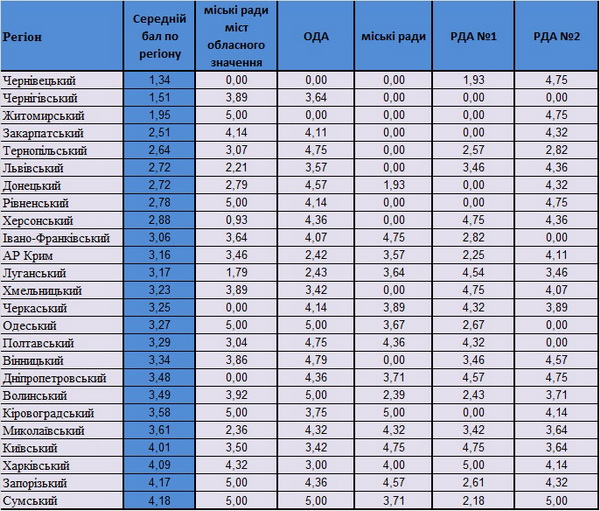 На жаль, жодна область в цілому не показала такий гарний результат як деякі обласні державні адміністрації та міські ради, однак Сумська, Запорізька, Київська та Харківська області змогли подолати чотирибальний бар’єр, втративши лише один бал з п’яти у рейтингу прозорості органів влади. Більшою мірою, на закритість цих регіонів вплинуло неналежне виконання Закону про Доступ районними державними адміністраціями та міськими радами невеликих міст в області.