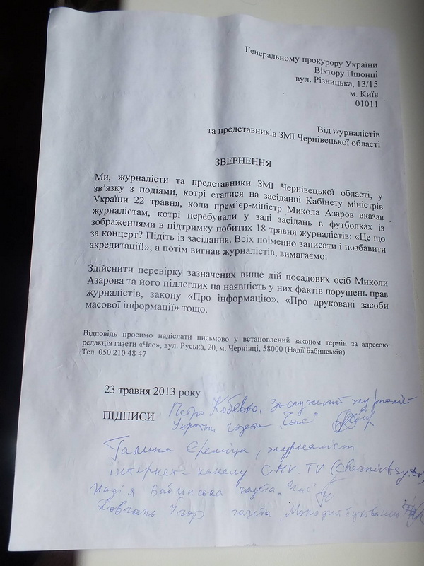Журналісти підписали два звернення: до Генпрокурора - щодо того, чому в середу Микола Азаров вигнав журналістів із Кабміну та до міністра МВС - з вимогою об’єктивного розслідування справи щодо побиття столичних журналістів 18 травня.