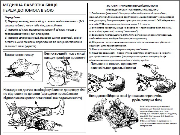 Неофіційно, памятка в аналогічному форматі була зроблена для спецпідрозділів і передана 1,5-2 місяці тому. Офіційно, після отримання запиту з відповідних структур, розробили представлену на фото. За цей час, нами підготовлений довідник. Будь ласка звертайтесь. Ми - практичні лікарі-хірурги. З повагою, автори.