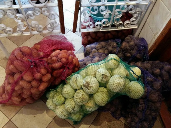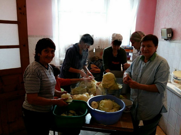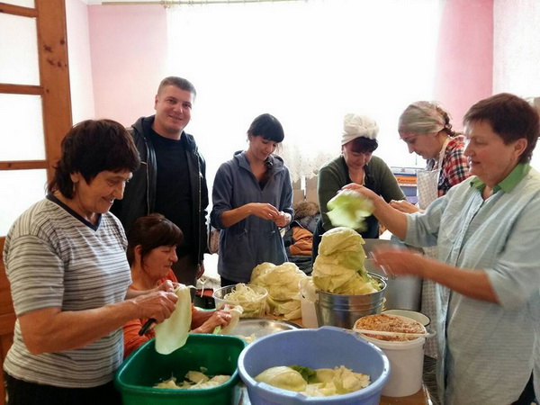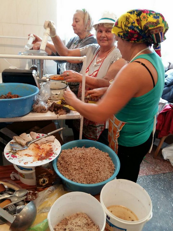 «Усього цього разу ми тільки м’яса переробили 70 кг, – каже волонтерка Лідія Гаїна. – Ще 40 кг запакували підчеревини. Могли би готувати плов, це простіше, але хлопці з передової просять голубців – і ми раді потішити їх домашньою їжею. Передаємо продукти добровольцям ОУН та Правого сектора, зараз вантаж повезли своїм транспортом бійці Правого сектора. Перед цим вони були тут на тренувальному полігоні, ми упродовж трьох днів забезпечували їм харчування під час вишколів».