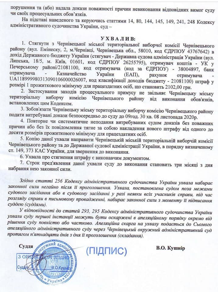 Накладення штрафу не звільняє Чернівецьку міську ТВК від пред'явлення затребуваних судом доказів, які мали бути надані окружному суду сьогодні.