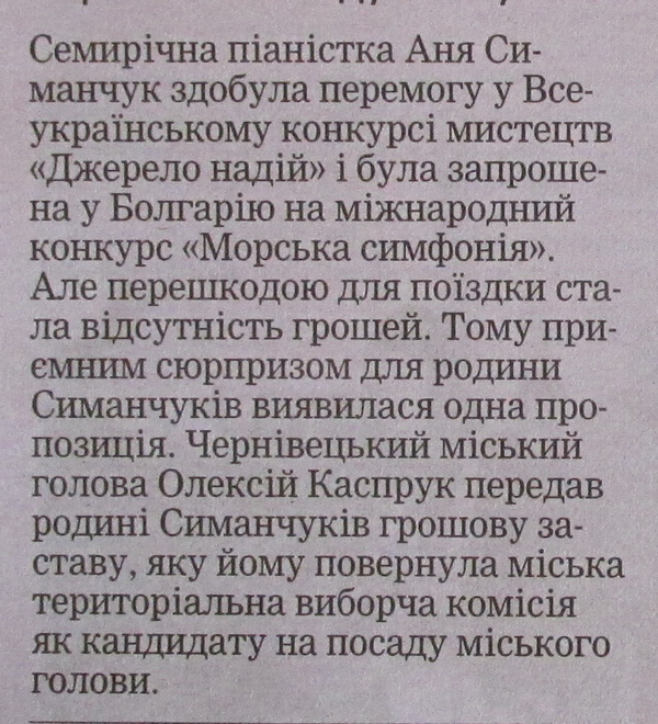 Юна піаністка, якій Чернівецький міський голова передав свою грошову заставу за участь у виборах, посіла друге місце на конкурсі в Болгарії
