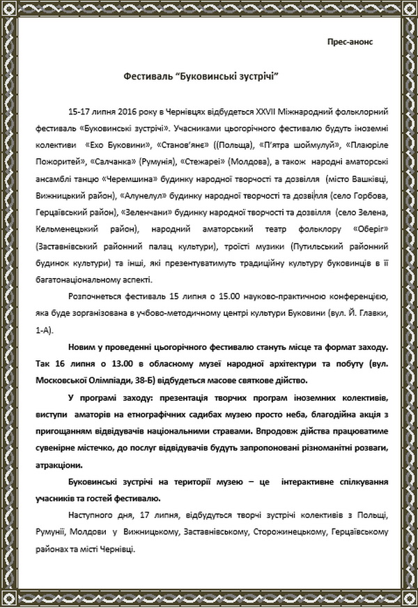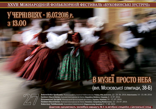 Шановні друзі! Сердечно запрошуємо вас на найколоритнішу подію буковинського літа - 27 Міжнародний фольклорний фестиваль "Буковинські зустрічі", який цього року відбудеться 16-17 липня в музеї просто неба!