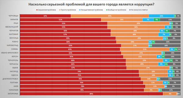 Наименее остро проблема коррупции стоит в Черновцах. Только 32% жителей считают ее серьезной.