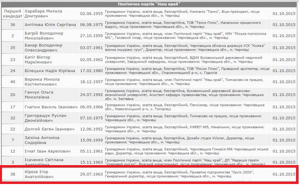 Згідно з інформацією розміщеною на офіційному сайті ЦВК, чинний депутат Чернівецької обласної Ігор Кірєєв знову змагатиметься за депутатський мандат. Цього разу відомий у Чернівцях підприємець вирішив поборотися за крісло депутата Чернівецької міської ради. Кандидатом у депутати його висунула партія «Наш Край», яку на теренах області очолює Микола Романюк.