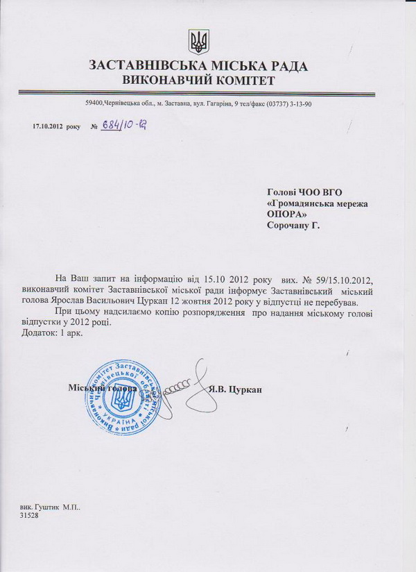 Нагадаємо, що 12 жовтня 2012 р. під час відкриття пам’ятника художнику Миколі Івасюку в місті Заставна Ярослав Цуркан під час свого виступу згадував про кандидата в народні депутати в 204 виборчому окрузі Артема Семенюка та дякував йому, як кандидату, за фінансову підтримку в споруджені пам’ятника вартістю в 168 тисяч гривень (http://oporacv.org/mer-zastavny-agituvav-za-artema-semenjuka/). Виступ міського голови Заставни (Чернівецька область) Ярослава Цуркана можна переглянути за посиланням: http://youtu.be/91uokYUUkfM. ОПОРА подала інформаційний запит, чи перебував міський голова Заставни станом на 12 жовтня у відпустці, та отримала відповідь, що той у відпустці не перебував (файл в додатку до повідомлення - vidpovidZapytZastavna.jpg).
