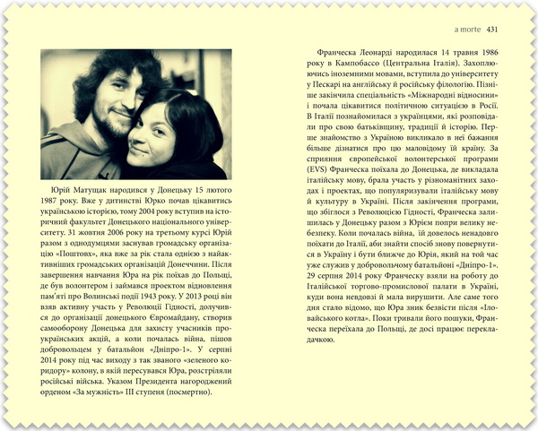 15 лютого, мало б виповнитися 30 років головному герою роману Олександри Іванюк «Амор[т]е» - донецькому вчителю історії, громадському активісту, добровольцю батальйону «Дніпро-1» Юрію Матущаку, який загинув в «Іловайському котлі».