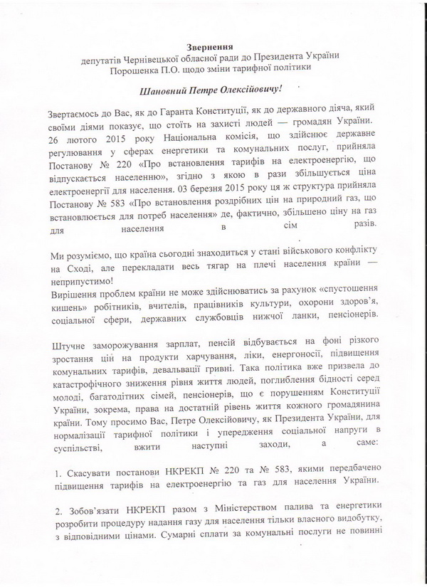 «Просимо Вас, Петре Олексійовичу, як Президента України, для нормалізації тарифної політики і упередження соціальної напруги в суспільстві вжити наступні заходи, а саме: