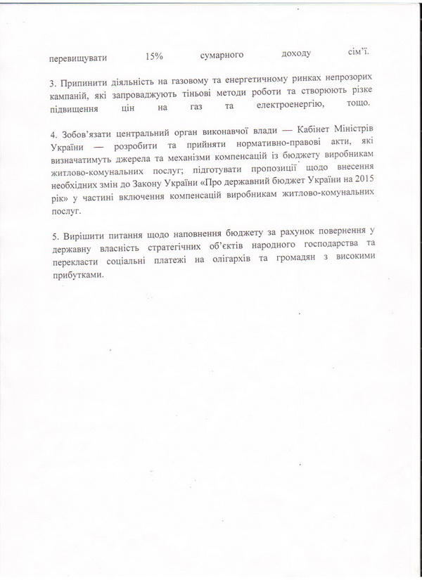 - Зобов’язати центральний орган виконавчої влади – Кабінет Міністрів України – розробити та прийняти нормативно-правові акти, які визначатимуть джерела та механізми компенсацій із бюджету виробникам житлово-комунальних послуг; підготувати пропозиції щодо внесення необхідних змін до Закону України «Про державний бюджет України на 2015 рік» у частині включення компенсацій виробникам житлово-комунальних послуг.