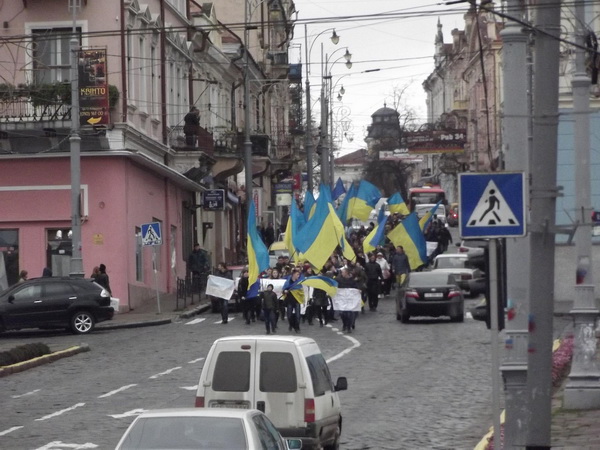 Ніхто нікого не організовував. Молодь підтягнулася на Євромайдан після заклику у соцмережах. На відміну від позавчорашнього мітингу, на площі - не видно партійний прапорів, в основному майорять національні та Євросоюзу. Зі студмістечка підійшла колона. До молоді доєднались небайдужі чернівчани та гості міста. Вже ближче до обіду на Центральній площі міста зібралось зо півтисячі громадян, які вимагали від влади продовжити процес підписання угоди про Асоціацію з ЄС. Люди виступають. Активіст Тарас Прокоп наголосив, що організатори планують створити комітет і координувати роботу серед студентства. Згодом активісти розклали два намети на Центральній площі і визначились з тим, що будуть ночувати на площі. Встановленню намета намагались завадити представники міліції, однак відступили. Хлопці збирають кошти на потреби євромайдану. Поки йде процес організації страйкового руху і розробка плану дій. Польовий командир Помаранчевого майдану Петро Олексюк дав рекомендації студентам. Треба звичні речі в таких випадках: теплі речі, чай, їжа. Целофан, дощовики, пінопласт - те, що точно зайвим не буде Готується звернення. Мітинг на завтра. На завтра запланований мітинг приблизно о 12.00-13.00. До участі закликаються працівники підприємств міста, небайдужі чернівчани. Готується текст звернення до президента, кабміну з вимогою підписати угоду, а до обласної та міської влади - скликати позачергові сесії та прийняти відповідне звернення з вимогою до центральної влади продовжити процес щодо підписання євроугоди. До речі, у активістів виникла ідея включити до оргкомітету Євромайдану голову Чернівецької ОДА Михайла Папієва та в.о. міста Віталія Михайлішина, як борців за євроінтеграцію (зокрема, 3 листопада в місті відбулось так зване Євроінтеграційне Віче, зорганізоване обласною владою). Після мітингу колона чернівецького Євромайдану пройшла вулицями міста.