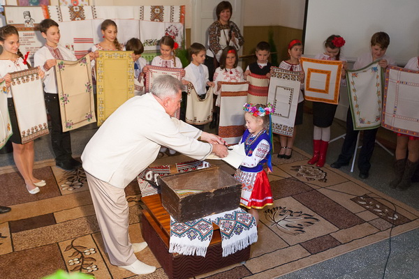 Алея дитячої творчості , самобутня буковинська співанка , веселкове різноманіття народних костюмів, в які вбралися діти, - особлива аура дійства . Розмай ошатних рушників створює мальовниче тло імровізованої сцени, посеред якої пишається старовинна скриня. Поважно і бережно відкриває її Михайло Григорович – один за одним виймає свої твори , які поштиво приймають діти і , стаючи півколом, утворють барвисте панно. Оживають на ньому рідне Поділля, Бойківщина й Гуцульщина, де Михайло Григорович жив і вчителював, Буковина, звідки родом його дружина . Читаємо на ньому узори Покуття, Галичини, Лемківщини...Читаємо на ньому подвижницьку долю самого Михайла Покиданця, який майже п»ятдесят років невтомно призбирує, відновлює, реставрує, зберігає, збагачує і популяризує народне орнаментальне мистецтво. Він – один з найперших номінантів обласної мистецької премії за збереження, примноження і розвиток народного мистецтва імені Георгія Гараса. Та найголовніше - він щедро ділиться своїми скарбами. Його рушники, серветки, вишиті панно, ікони і картини – в різних куточках планети, де живуть українці, - Північній і Південній Америці, Канаді й Австралії, Польщі і Словаччині, Чехії і Румунії, Бразилії і Росії. В багатьох країнах побували його твори, зігріті натхненним серцем і створені невтомними руками. На різних широтах світового українського духовного простору рукодільниці ворожать над своїм ремеслом за узорами Михайла Покиданця. З легкого починання всеукраїнського журналу «Жінка» ( в якому Михайло Григорович дебютував зі своїми малюнками орнаментів і який заохочував і «підстьобував» митця до творчості) за Покиданцем вишивала –без перебільшення - вся Україна . І зараз його численні візерунки передруковують вітчизняні й закордонні видання і поширюють різні видавництва. В багатьох українських оселях присутня частинка його душі – вишиття за вишуканими узорами. І ці чепурні школярики, які оце зараз бережно тримають неповторні рукотвори майстра, переймають у нього секрети майстерності в шкільному гуртку вишивки, власноруч створили свої вишиванки, сценічні костюми для учасників танцювального ансамблю народного танцю «Вітерець», яким керує Михайло Покиданець.Це невід»ємна складова його педагогіки . І великою мірою – прояв характеру: він робить усе послідовно, прискіпливо й