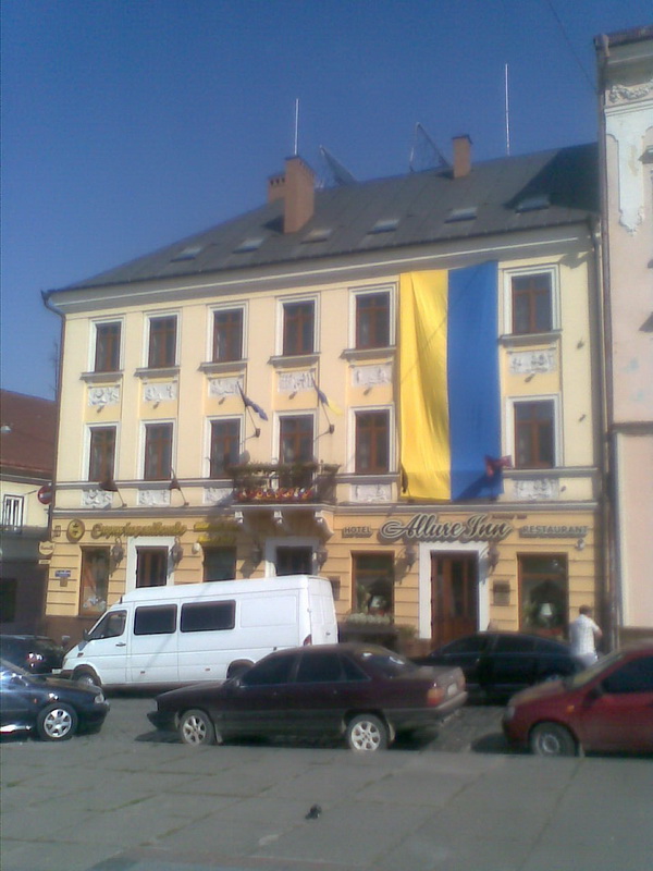 Фасад чернівецького готельно-ресторанного комплексу "AllureInn", що на Центральный площі міста, прикрасило багатометрове полотно у кольорах державного прапора.