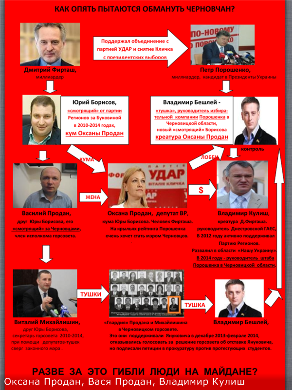 Люди,послушав радио-интервью Оксаны Продан понимаешь ,что "девочка" рвется к власти любыми путями и обманом.За её красивым дрожащим голосом скрывается взять под контроль Сбу Черновицкой области поставив на должность Кицула "титушку"фирташа и папиева.При этом схоронив свои старые черные криминальные схемы.