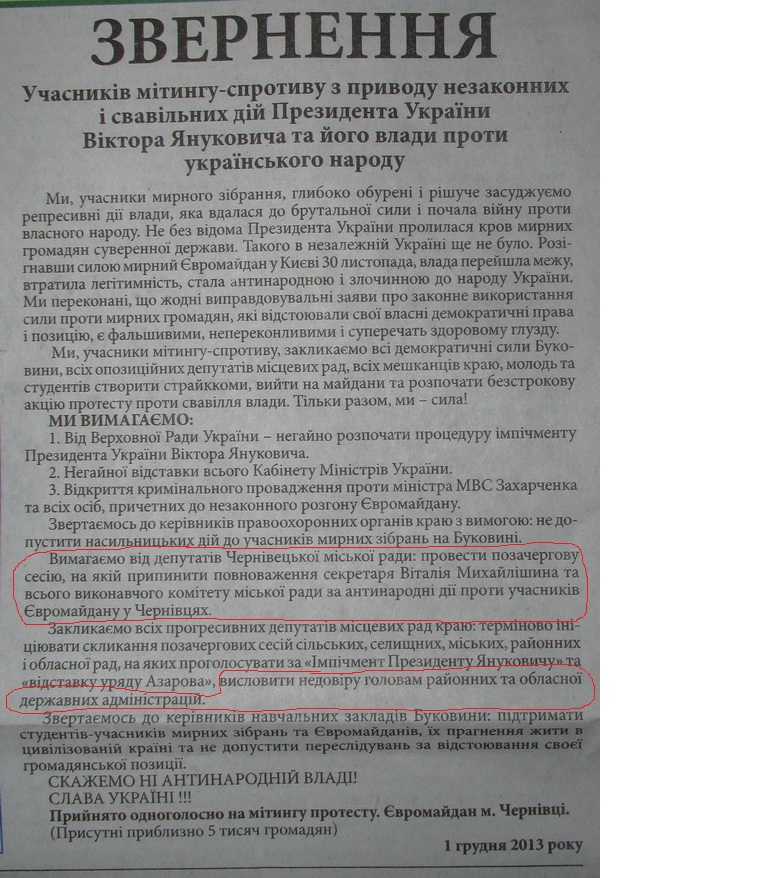 “Ми, учасники страйкового комітету студентів міста Чернівці, підтримуємо позицію Чернівецької міської ради, яка стосується євроінтеграційного курсу України та засуджуємо осіб, які брали участь у побитті учасників мирного зібрання вночі з 29 на 30 листопада на Майдані Незалежності в м.Києві.