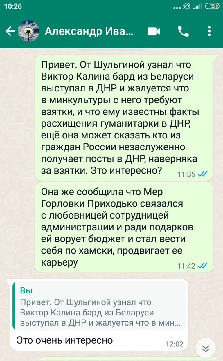 Наприкінці серпня 2022 киянин вкотре поділився з Іванченком інформацією про "мера" Горлівки, що призначив батька коханки керівником автовокзалу, а також почав красти гуманітарку разом із місцевим кримінальником Арсеном.
