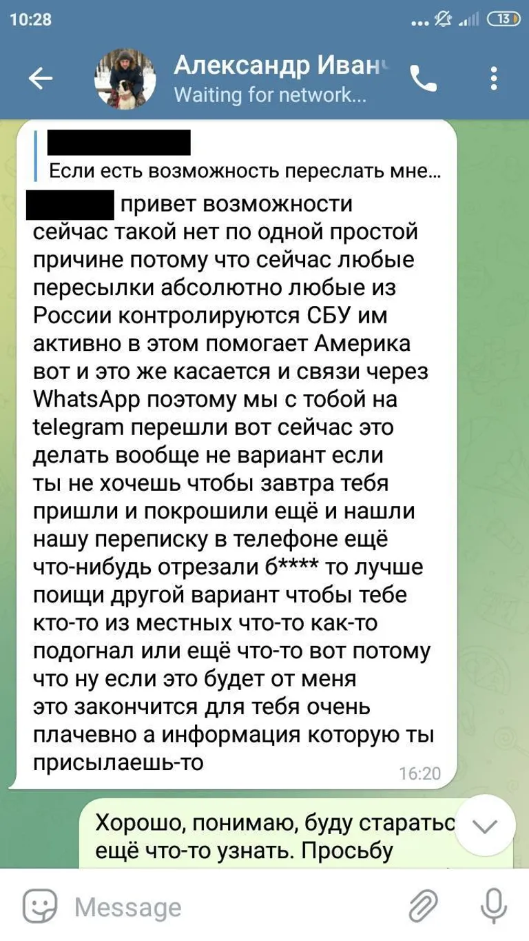 Майже 6 місяців знадобилося ФСБшнику, аби таки вмовити свого агента почати спілкуватися у телеграмі, який є підконтрольним російським спецслужбам. Однак зміна месенджеру ніяк Іванченку не допомогла: він і надалі отримував купу даних про злочини росіян на захопленій Кремлем території.