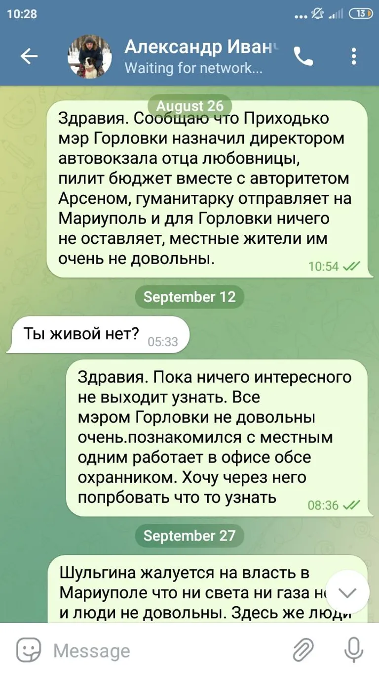А поки оплати за співпрацю не було, киянин шукав варіанти, як вислужитися перед керівництвом. Однак здебільшого збирав інформацію геть не про якісь важливі для ФСБ нюанси життя на підконтрольній Києву території, а про корупцію та бандитизм у "ДНР".