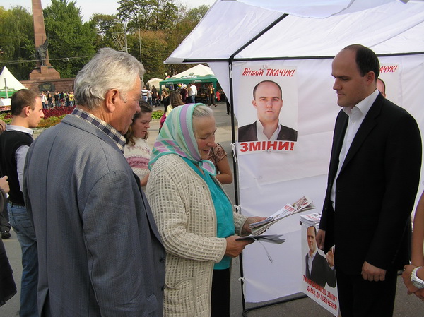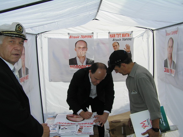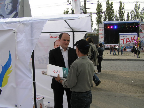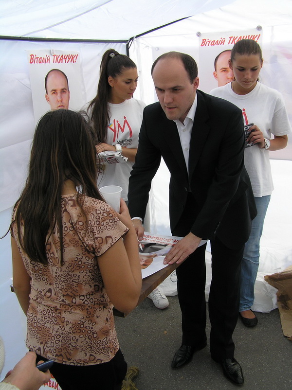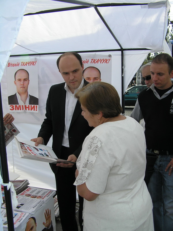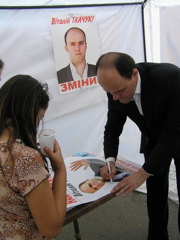 Проте найоригінальнішим з поміж цих трьох Віталіїв виявився третій Віталій. Спілкуванню з картонками кандидат у депутати Віталій Ткачук протиставив живе спілкування з виборцями. На відміну від картонних зображень його конкурентів, з ним можна було сфотографуватися, що називається, в живу. І люди нагодою широко користалися. Їх захоплювало те, що з кандидатом - точнісінько таким самим, як на плакаті, - можна було запросто поговорити, потиснути руку, а то й отримати автограф. Дехто спочатку не вірив, що це не підстава, а Віталія Ткачука насправді зображає актор. Розібравшись, що кандидат справжній, люди дякували за увагу до себе, дехто навіть просив дозволу сфотографуватися з кандидатом на власний мобільний телефон. А чоловік, який теж виявився Ткачуком, попросив у політика і співака автограф. Друковна продукція з програмними засадами канидатата, його плакати, календарики, газети з інтерв'ю розліталися наче гарячі пиріжки.