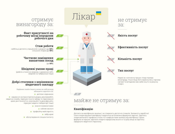 Преміювання та встановлення надбавок (крім доплат за часткове заміщення вакантних посад, стаж, кваліфікаційну категорію) відбувається нечасто через брак фінансових ресурсів, пише видання."Інша проблема менш очевидна - оплата праці медика-бюджетника не має або майже на має відношення до того як, власне, медики лікують. Зарплата мало залежить від якості, кількості та типу послуг що надаються", - йдеться у повідомленні.