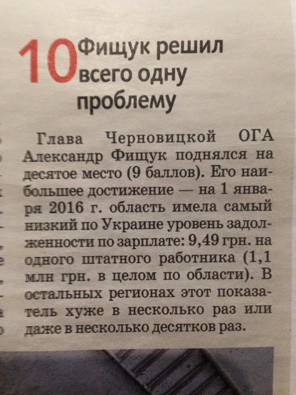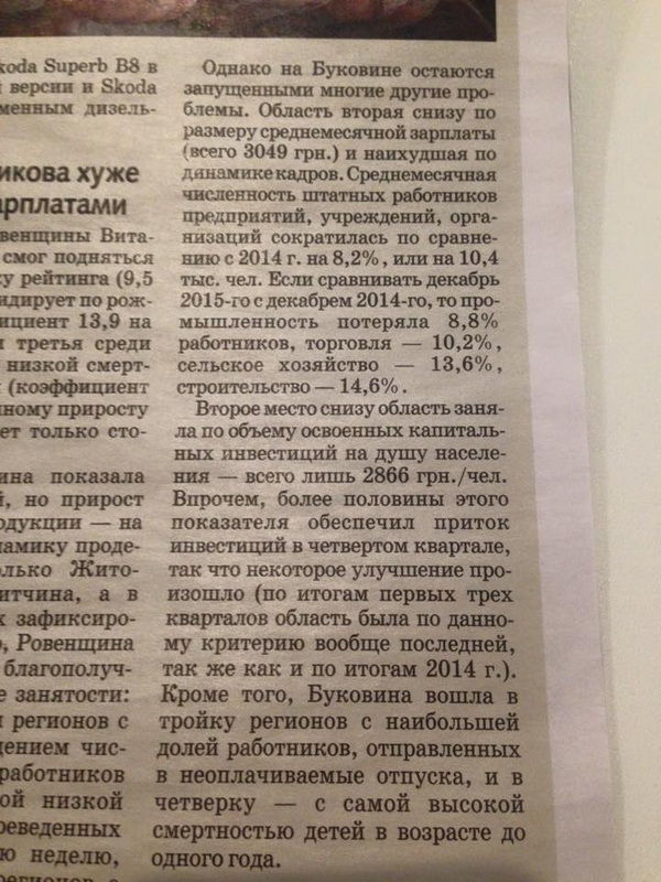 Ченівецька область друга з кінця рейтингу за розміром середньомісячної зарплати (3049 грн.). Друга з кінця за обсягом освоєних капітальних інвестицій на душу населення (2866 грн./особа), однак більше половини інвестицій надійшло в 4му кварталі - це свідчить про позитивну динаміку. Крім того, Чернівецька область увійшла до трійки областей з найбільшою долею працівників, відправлених у неоплачувану відпустку та в четвірку - із найвищою смертністю дітей у віці до одного року. За матеріалами "Ділової столиці" підготував Вадим Міський.