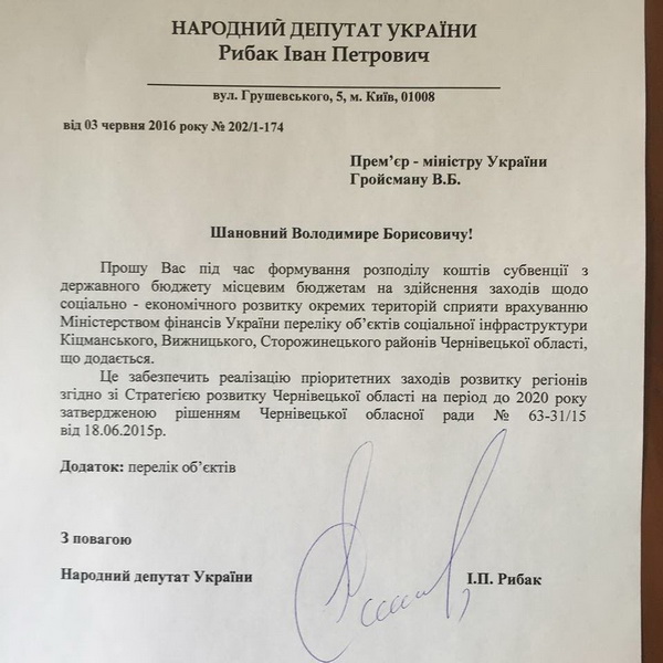 Також Іванові Рибаку адресували звернення з проханням посприяти у виділенні додаткових коштів на погашення заборгованості по заробітній платі та переглянути «формульний розрахунок» базової дотації для гірських районів. Адже грошей вистачає лише на 50 відсотків. Однак, за словами Миколи Петровича, народний депутат не дав відповіді на жодного листа і з його боку не відчувається ніякої підтримки. Вже близько року Іван Рибак не заходив в райдержадміністрацію та не проводив у районі прийом громадян. А коли все ж з'являється на Путильщині, то спілкуватися з людьми часу не має.