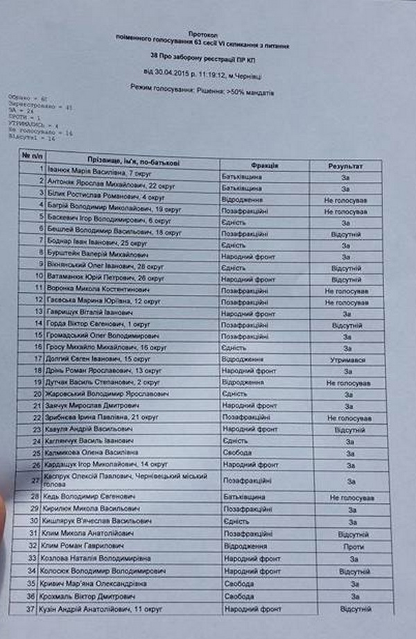 Хто з депутатів Чернівецької міськради голосував за заборону реєстрації осередків КПУ, ПР та Опозиційного блоку (ДОКУМЕНТ)