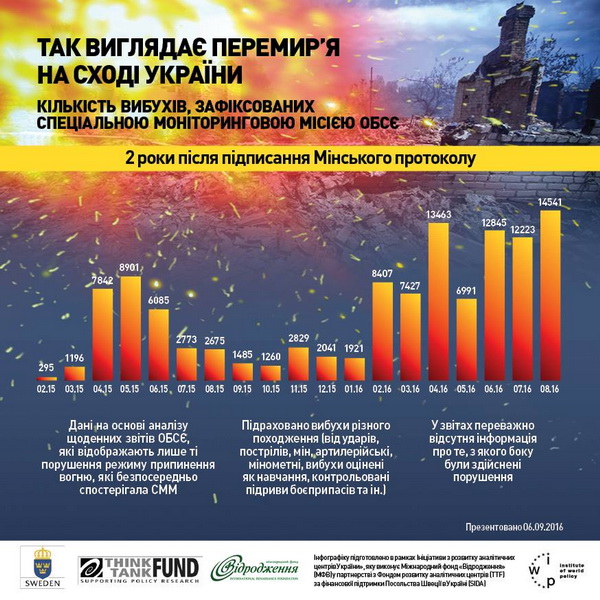 1. У серпні 2016 року зафіксовано найбільшу кількість вибухів на Сході України з лютого 2015 року (підписання других Мінських домовленостей) - 14 541. Детальніше в інфографіці.