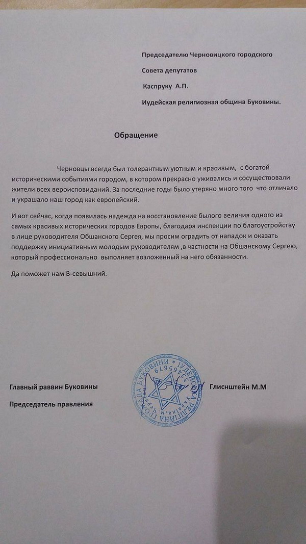 Листа відповідного змісту на адресу міського голови О.Каспрука надіслав головний рабин Буковини Менахем Мендл Гліцнштейн.