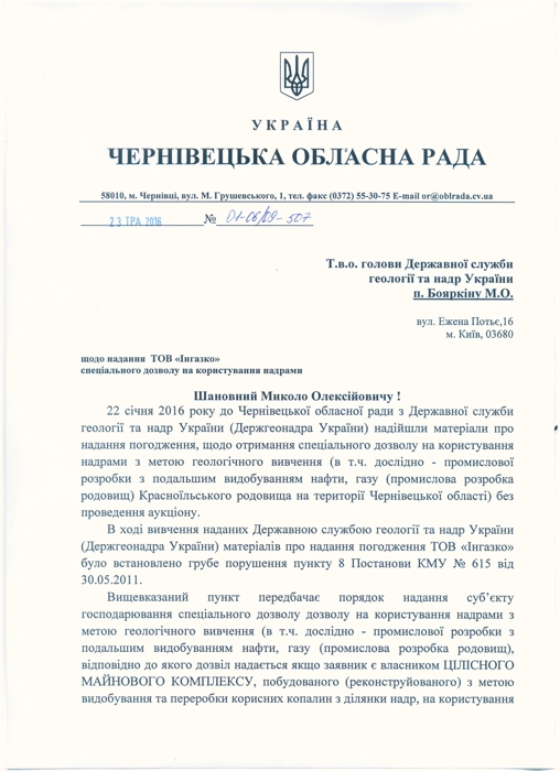 - Підставою для скасування спеціального дозволу, - на думку авторів листа, - має стати надання ТОВ "Інгазко" недостовірних даних при подачі документів. У разі, якщо вимогу про скасування спецдозволу буде проігноровано, голова обласної ради Іван Мунтян запевняє, що облрада позиватиме державний орган до суду, а також звернеться в Національне антикорупційне бюро.