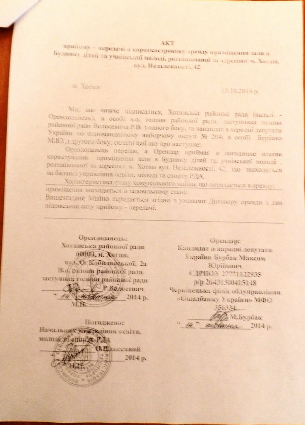 На думку спостерігачів ОПОРИ, вказана подія може трактуватись як порушення правил ведення агітації, адже вказаним кандидатом не було укладено відповідних договорів на проведення агітації. Під час свого виступу Василь Забродський висловив сумнів щодо того, чи був оформлений договір оренди цього приміщення для проведення зустрічі з виборцями кандидата Максима Бурбака. На прохання спостерігача ОПОРИ одразу після зустрічі йому був наданий Договір оренди вказаного приміщення, акт виконаних робіт та банківська платіжка. Стосовно зауважень Василя Забродського, що присутні на заході виборці були “залучені із застосуванням адміністративного ресурсу”, то спостерігач ОПОРИ не знайшов підтвердження цієї тези.